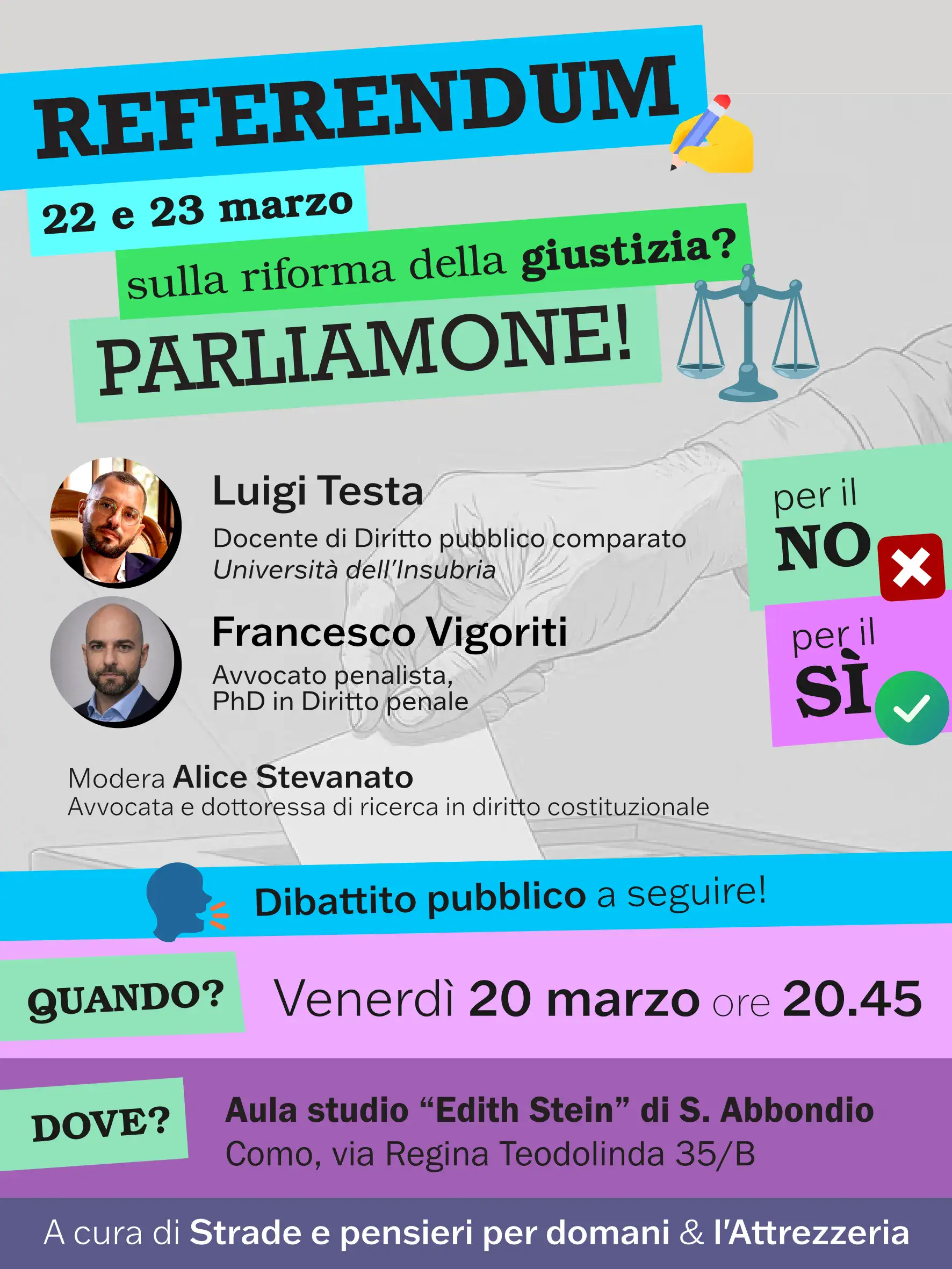 A pochi giorni dalla consultazione, presso l'Aula studio "Edith Stein" di Sant'Abbondio, a Como, si è tenuto un incontro riassuntivo e di dibattito sull'imminente referendum costituzionale sulla riforma della magistratura. È stato organizzato dalla rete Strade e pensieri per domani, con la collaborazione dell'Attrezzeria.