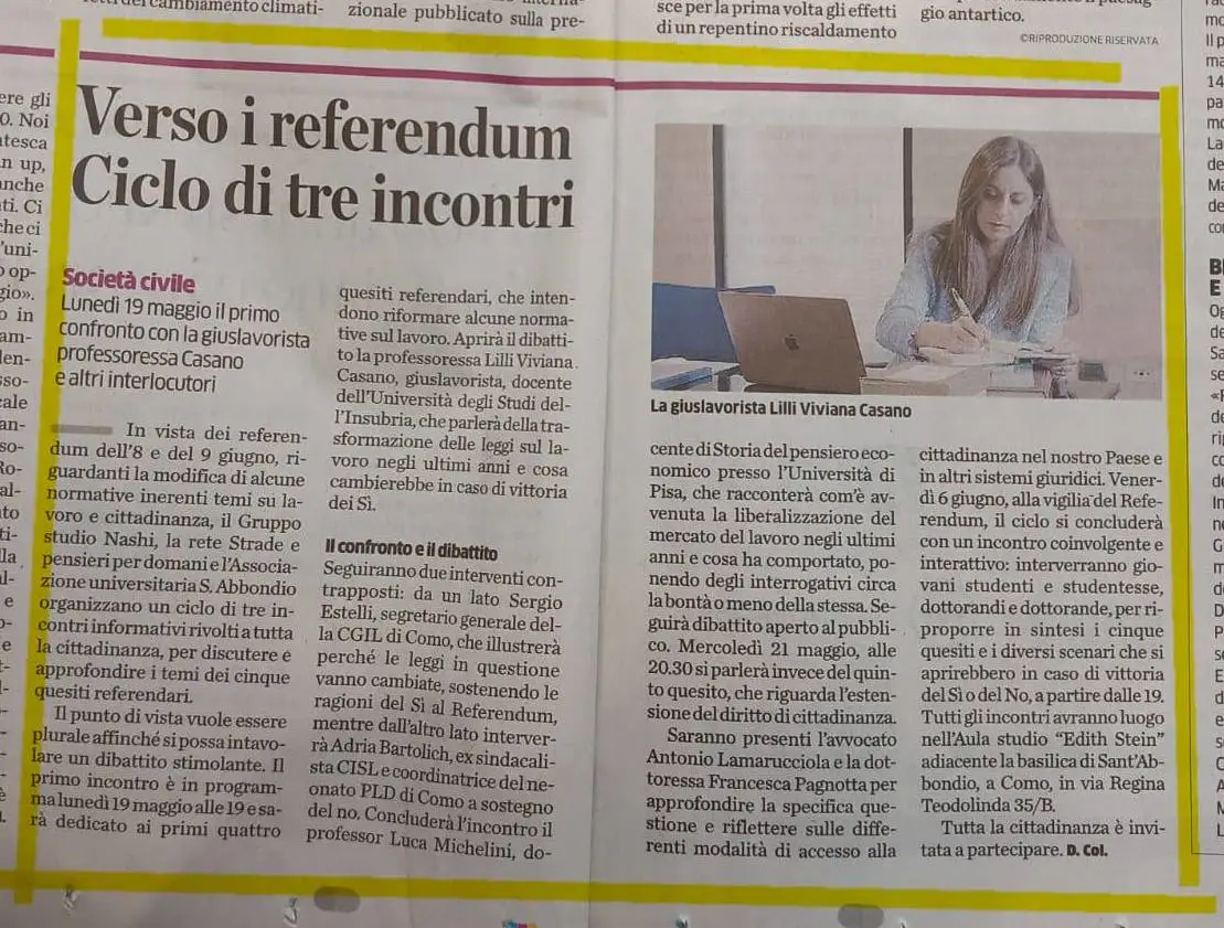 In vista dei referendum dell’8 e 9 giugno, che hanno chiamato l* cittadin* a esprimersi su importanti modifiche in materia di lavoro e cittadinanza, abbiamo organizzato[1] un ciclo di incontri intitolato Referendum? Parliamone!, assieme alla rete Strade e pensieri per domani[2] e all’associazione universitaria Sant’Abbondio[3], per comprendere i cinque quesiti, stimolare la riflessione critica e il dibattito. Gli incontri erano aperti a tutta la cittadinanza.